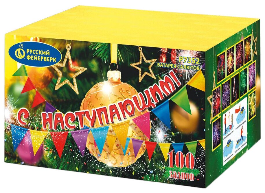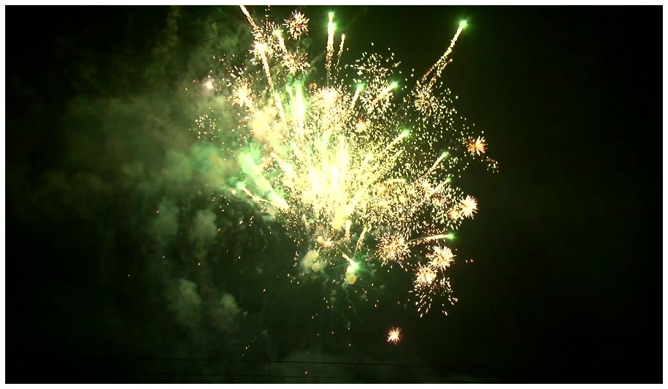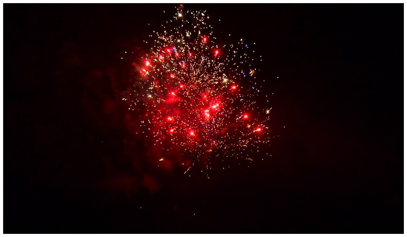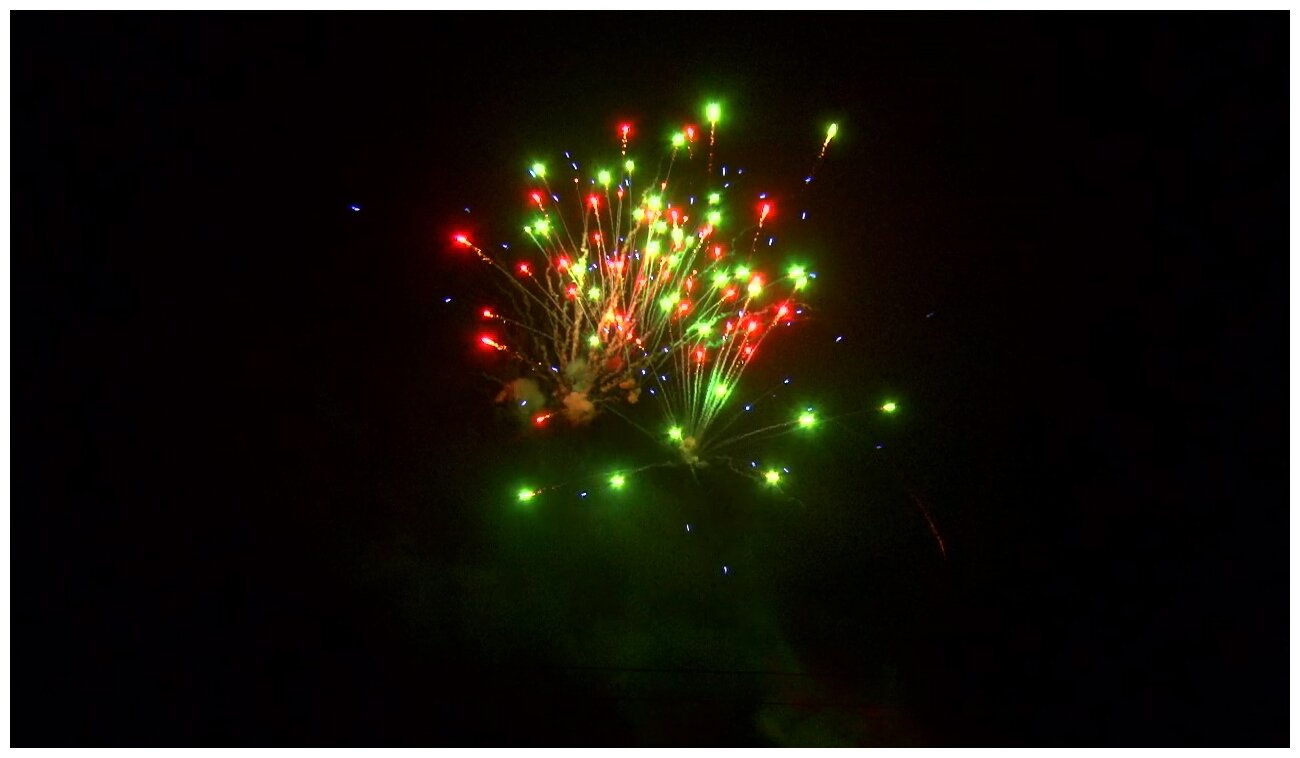 5 эффектов: 1. Красно-белая мерцающая сфера (пион). 2. Зеленые звезды с пышными хвостами (кокос) и треск. 3. Красные звезды с пышными хвостами (кокос) и облако треска (трещащий дождь). 4. Зелено-фиолетовая мерцающая сфера (пион). 5. Красно-сине-зеленая сфера (пион) и облако треска (трещащий дождь).