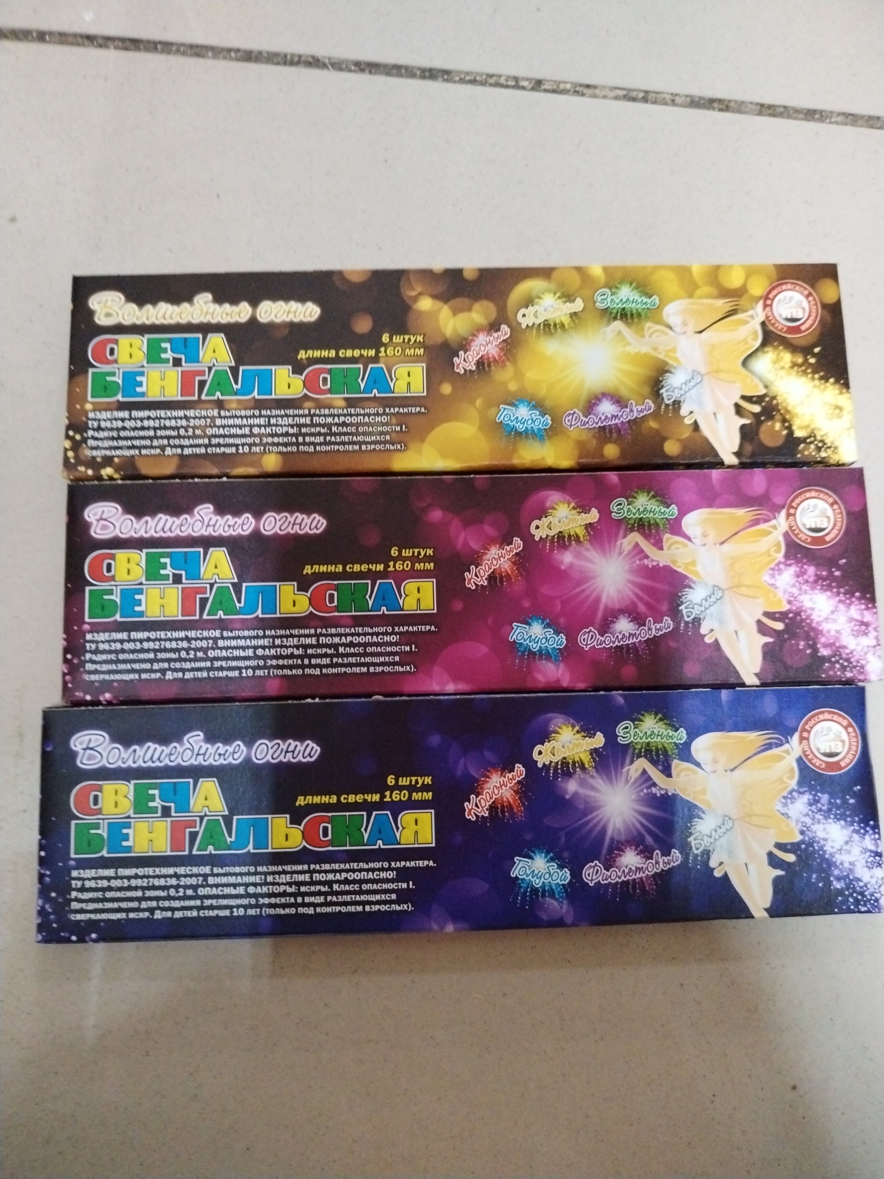 Хорошо поджигаются и равномерно горят сверкающим огненным шаром, разбрасывая искры. Подходит для использования внутри помещений. Бенгальские свечи – самый известный фейерверк, который помнят все поколения. После воспламенения образует зрелищный эффект в виде золотистого огня, окруженного ореолом серебристых искр. Инструкция по применению: Взять свечу за свободный от состава стержень. Поджечь состав от спички или зажигалки, не наклоняясь над свечой, и держать горящую свечу на вытянутой руке. Стержень после сгорания состава, выдержать на воздухе до полного остывания с последующей утилизацией с бытовыми отходами. Запрещается: - производить любые действия, не предусмотренные настоящей инструкцией; - использовать свечи с признаками разрушения и с истекшим сроком годности; - продажа изделий детям до 10 лет; - использовать свечи детям без контроля взрослых; - продажа вне потребительской упаковки. Хранение: В помещениях при температуре от минус 30°С до плюс 40°С и влажности не выше 80%. В непосредственной близости от свечей не должно быть отопительных систем, легковоспламеняющихся предметов и электронагревательных приборов. Не допускается на упаковки со свечами попадание прямых солнечных лучей и атмосферных осадков. Утилизация: Утилизацию отказавших, с признаками разрушения или с истекшим сроком годности свечей производить замачиванием в воде в течение 2 часов и последующей утилизацией с бытовыми отходами. Соответствует Техническому регламенту Таможенного Союза "О безопасности пиротехнических изделий" и ГОСТ 33732-2016 по требованиям безопасности. Внимание! Изделие пожароопасно! Радиус опасной зоны 0,2 м. Опасные факторы: искры. Класс опасности I.