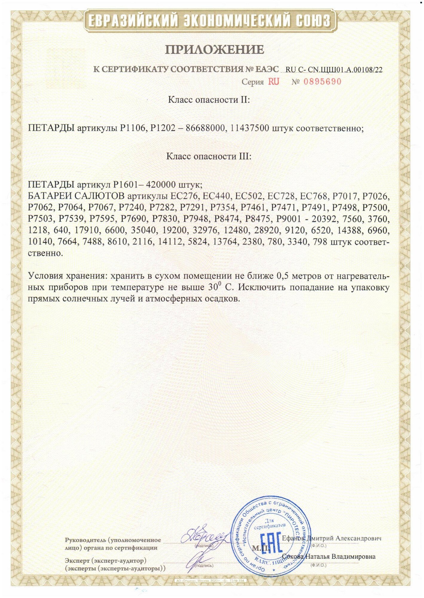 Дополнительная информация: Хранить в сухом помещении не ближе 0,5 метров от нагревательных приборов при температуре не выше 30С, исключив попадания на упаковку прямых солнечных лучей и атмосферных осадков. Сведения о применяемых стандартах: ГОСТ Р 51270-99 "Изделия пиротехнические Общие требования безопасности"