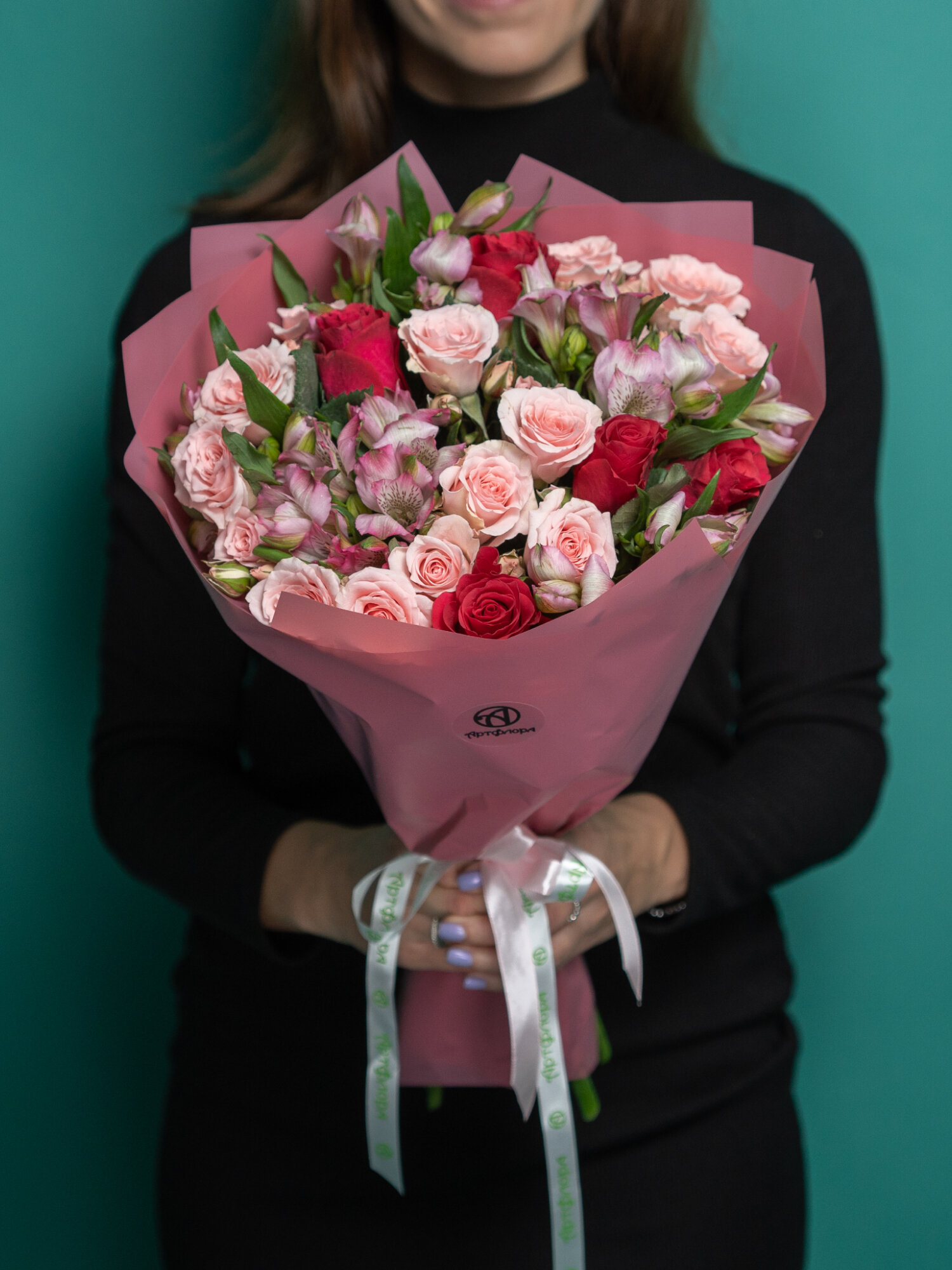 Букет из кустовых роз, альстромерий и роз Кения - S - это изысканный и стильный подарок, который станет прекрасным дополнением к любому торжеству или событию.