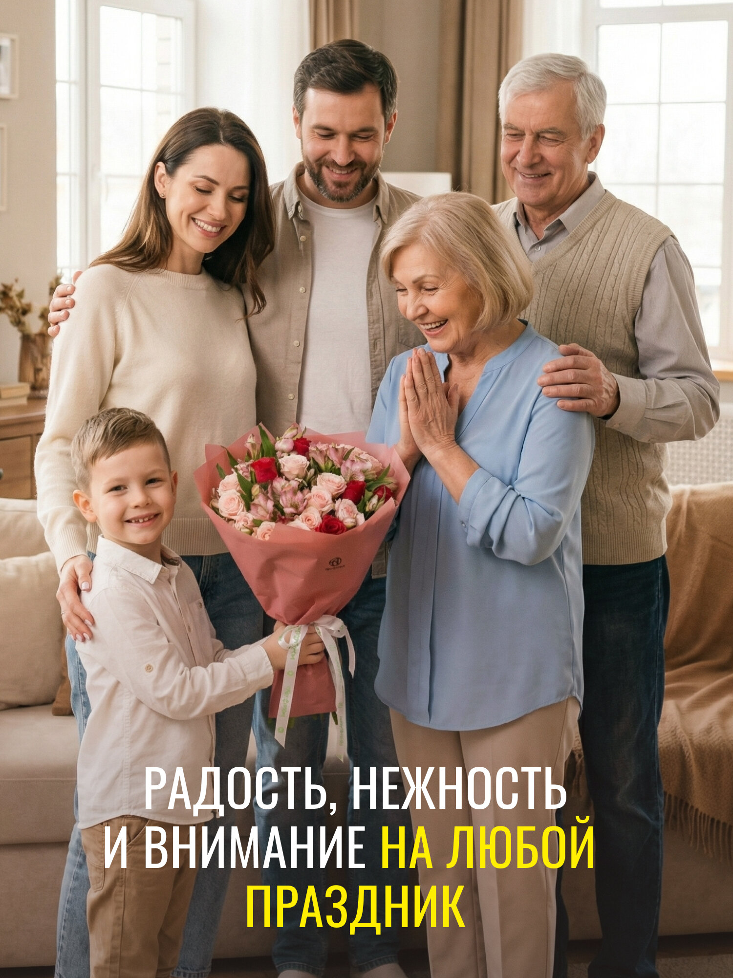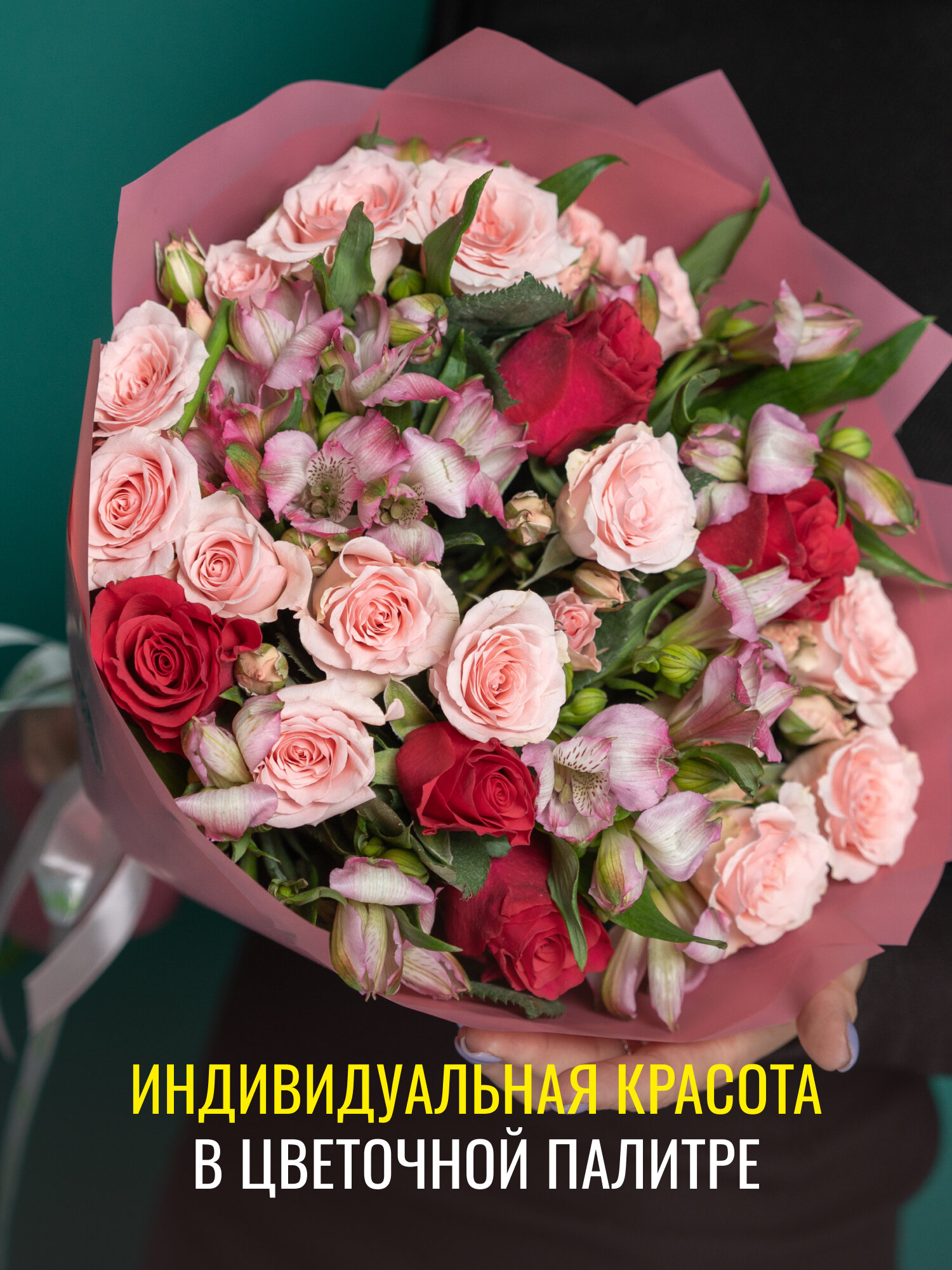 Букет состоит из кустовых роз, альстромерий и роз Кения. Кустовые розы придают букету нежность и воздушность, а альстромерии и розы Кения добавляют яркость и экзотику.