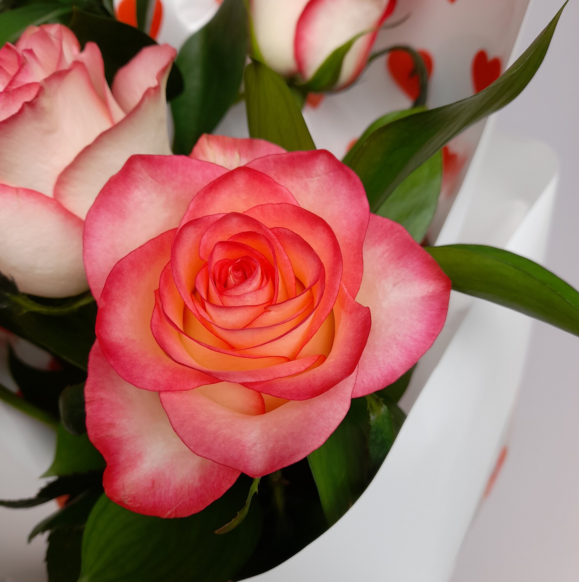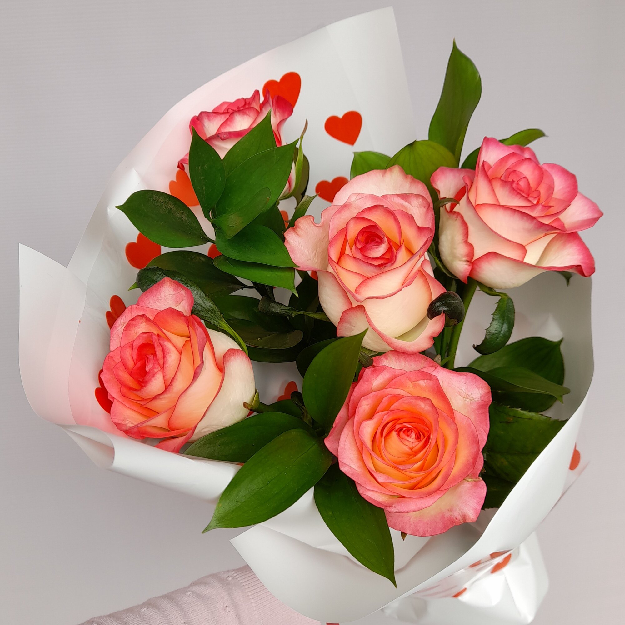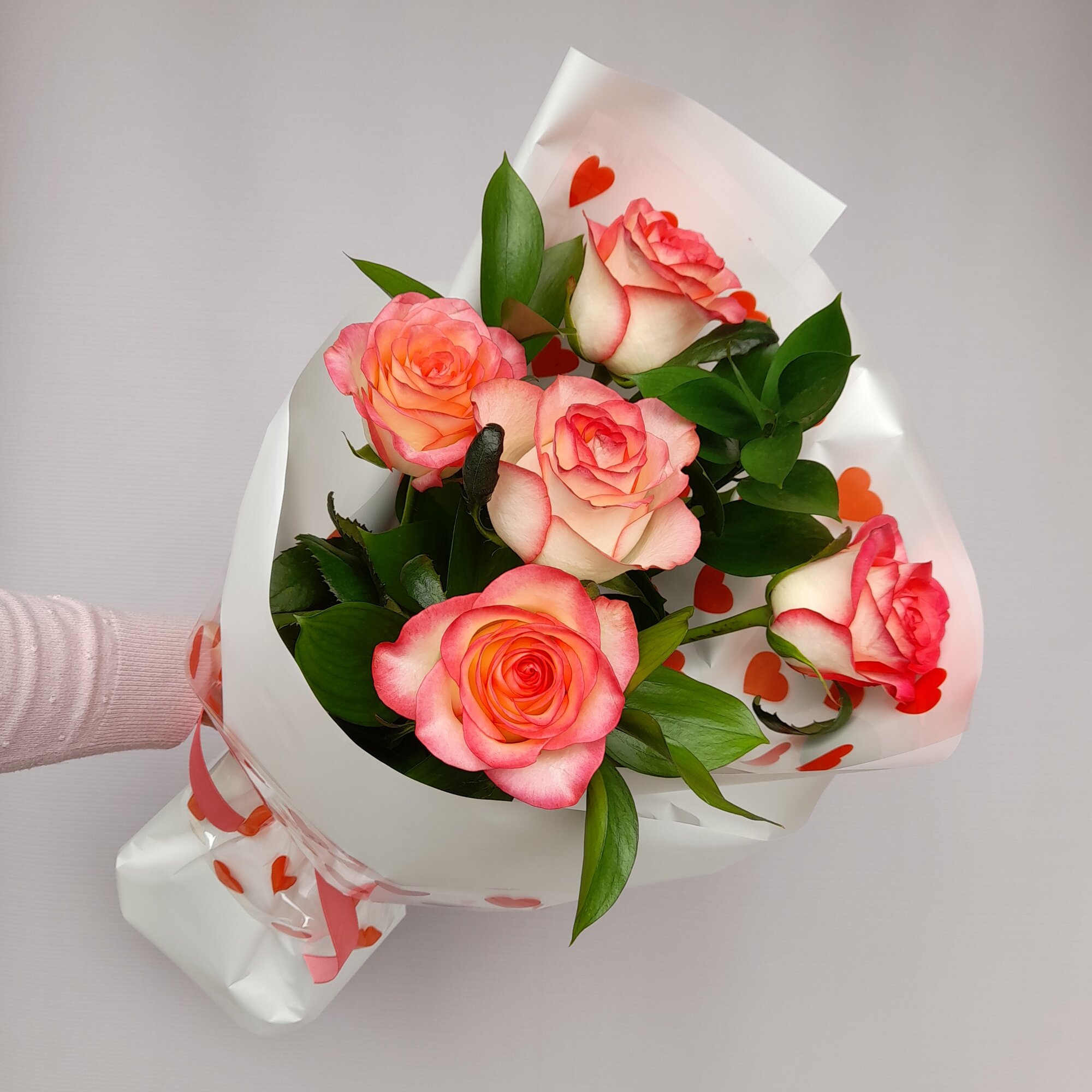 Букет собран на стеблях и оформлен под в контрастную упаковку с добавлением пленки с сердцами, что делает его еще более привлекательным и аккуратным.