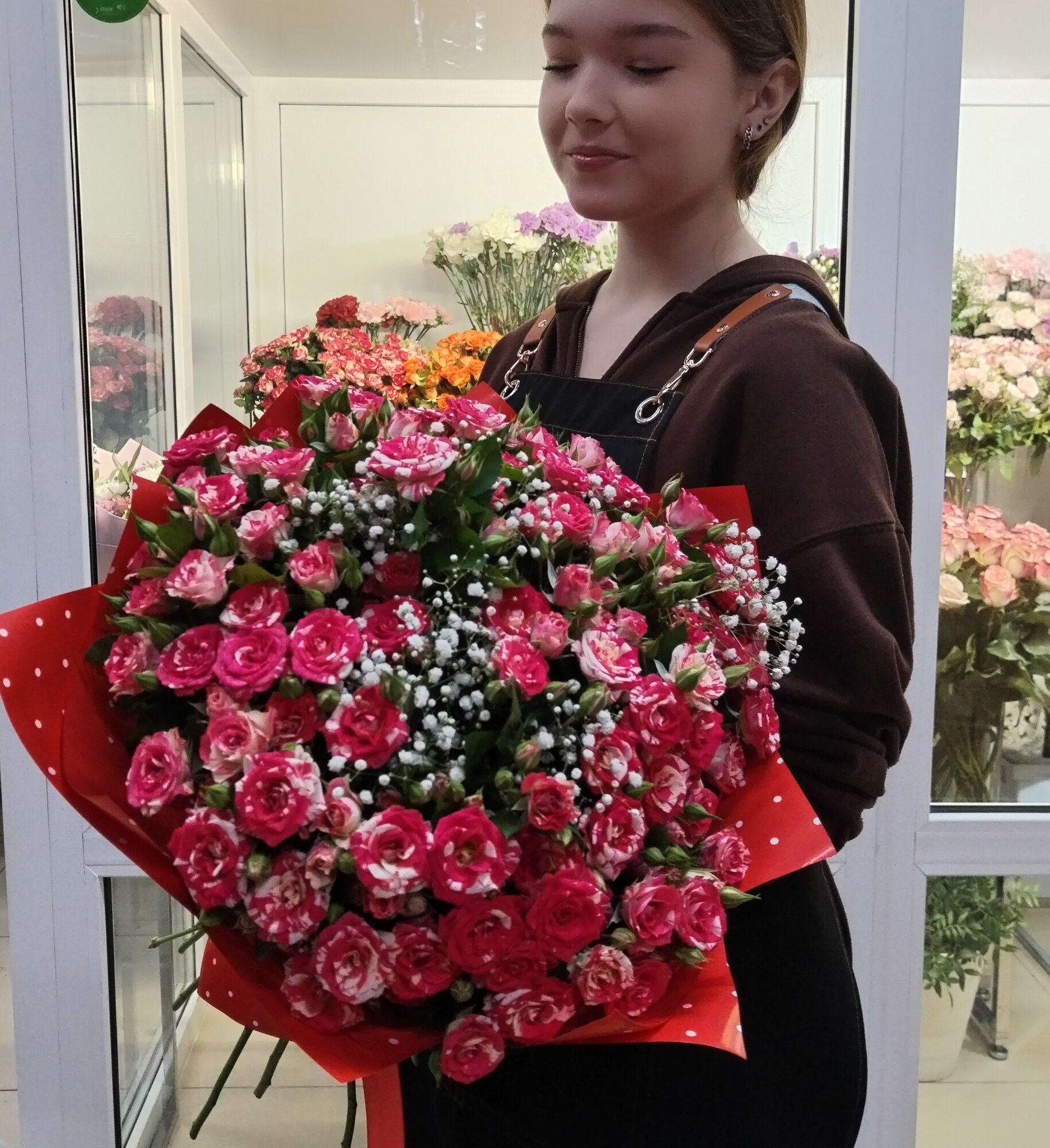 Букет из 19 кустовых роз с белой гипсафилой - это изысканный и стильный подарок, который станет прекрасным дополнением к любому торжественному событию.
