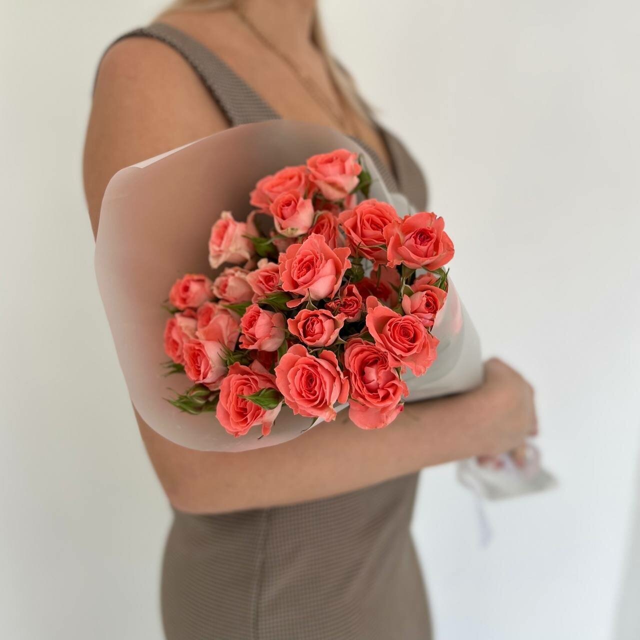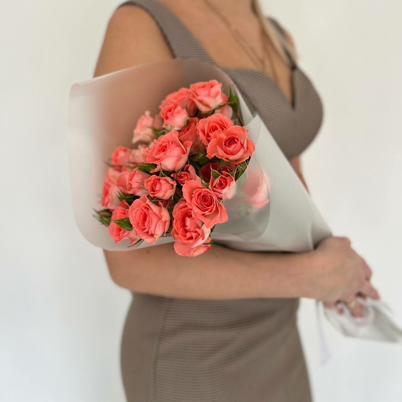 Состав букета включает в себя 5 кустовых роз, обернутых в крафт-бумагу и оберточную бумагу. Это придает букету изысканный и стильный вид.
