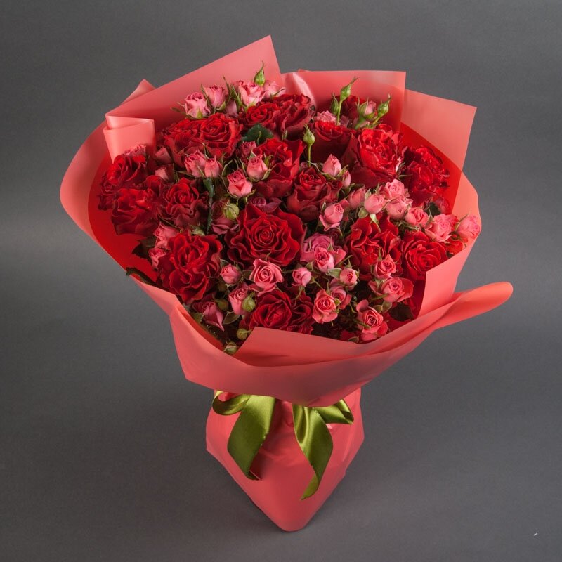 Букет из красных одноголовых и розовых кустовых роз-прекрасный выбор для тех, кто хочет произвести впечатление!