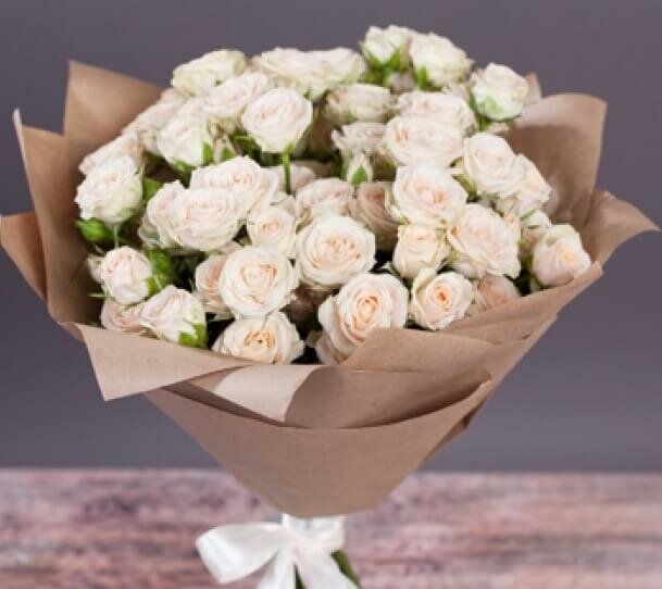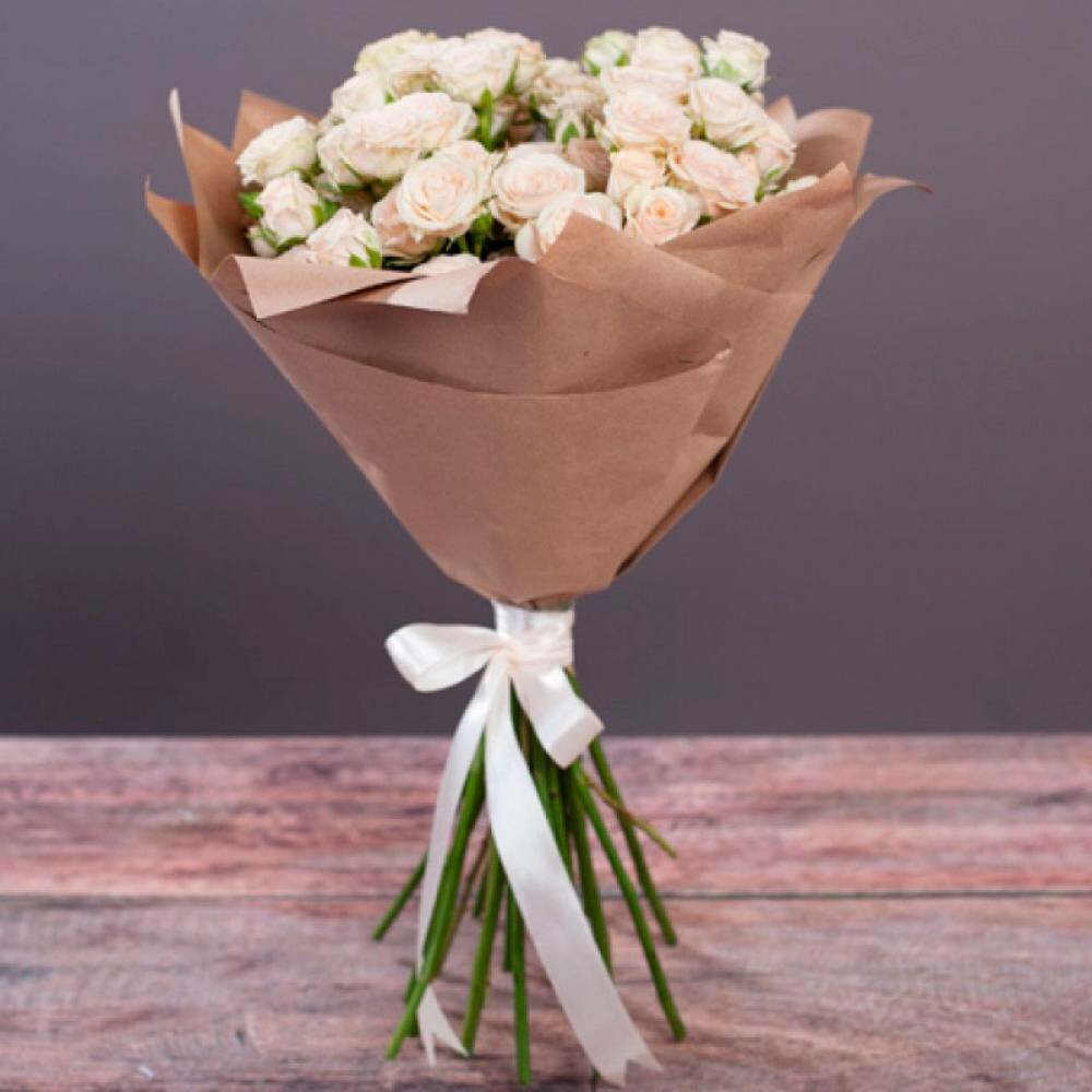 Букет из 9 живых кустовых роз в упаковке с лентой.