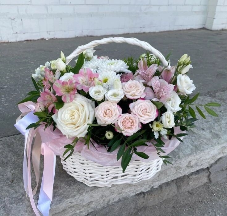 В составе букета - роза, альстромерия и хризантемы. Эти цветы прекрасно сочетаются между собой, создавая гармоничную композицию. Роза придает букету нежность и романтичность, альстромерия - легкость и воздушность, а хризантемы - теплоту и стабильность.