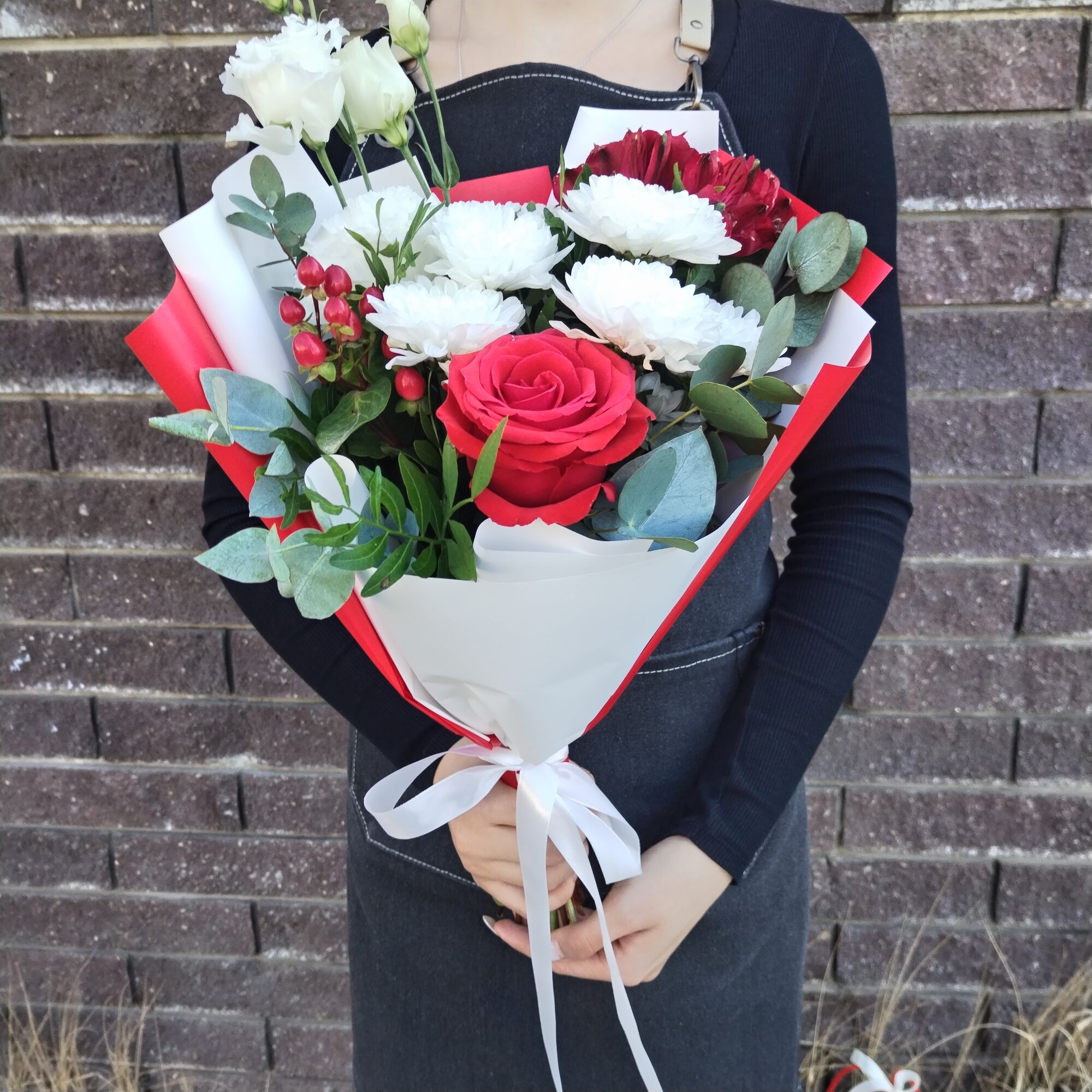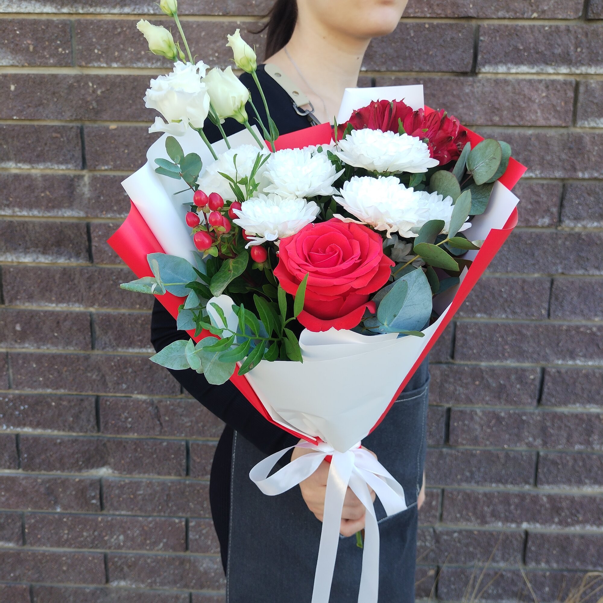 Букет с розой, хризантемой, эустомой, и гиперикумом