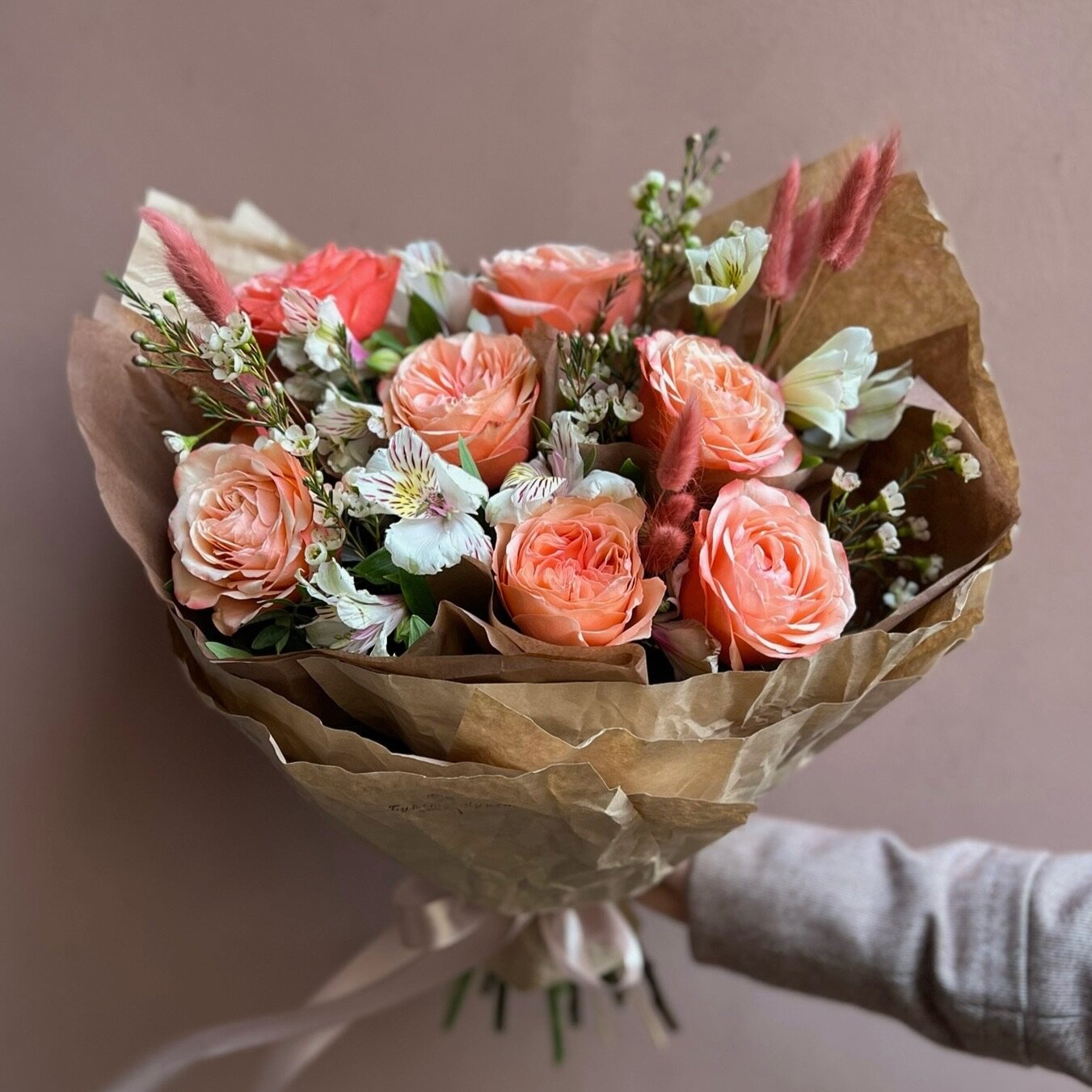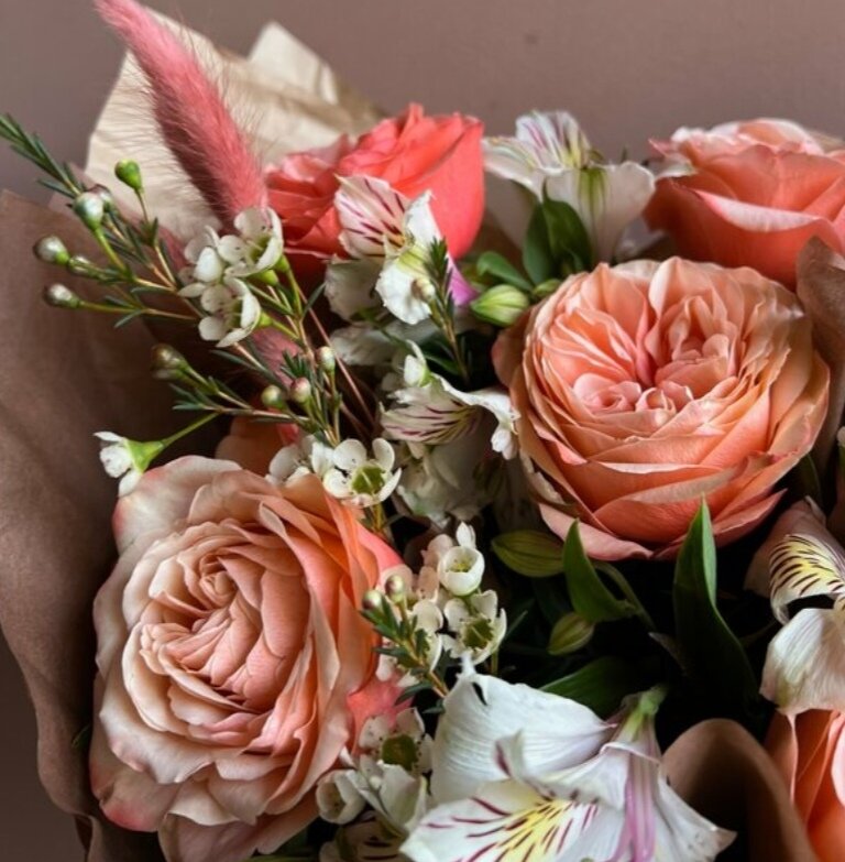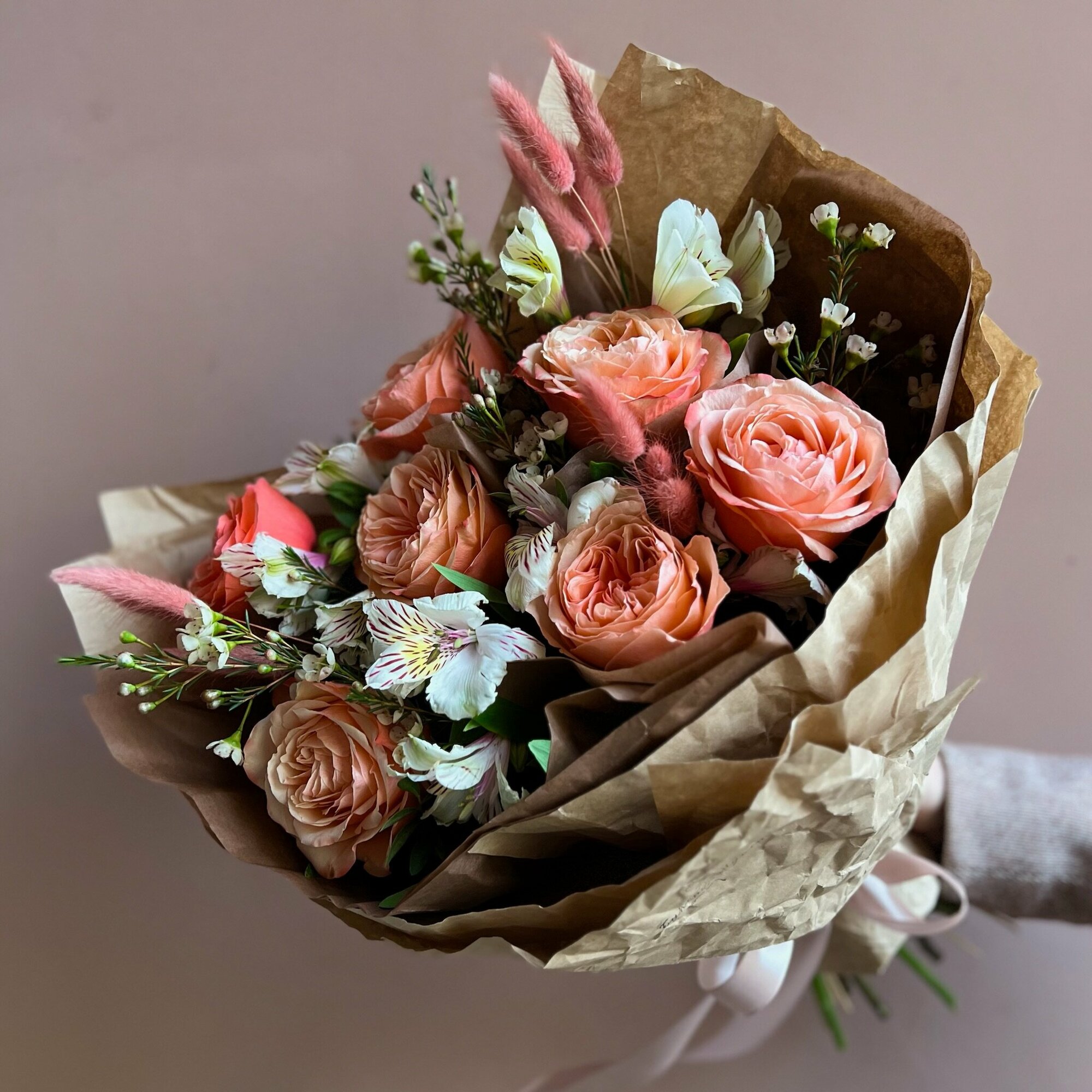 Букет «Александра» – это PETRO, собранное из пионовидных, но одних из самых стойких роз кахала, альстромерий, хамелациума и сухоцветов лагурус.