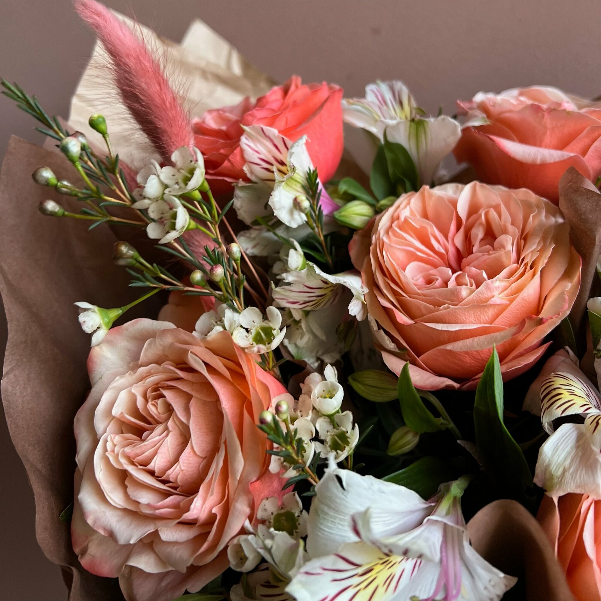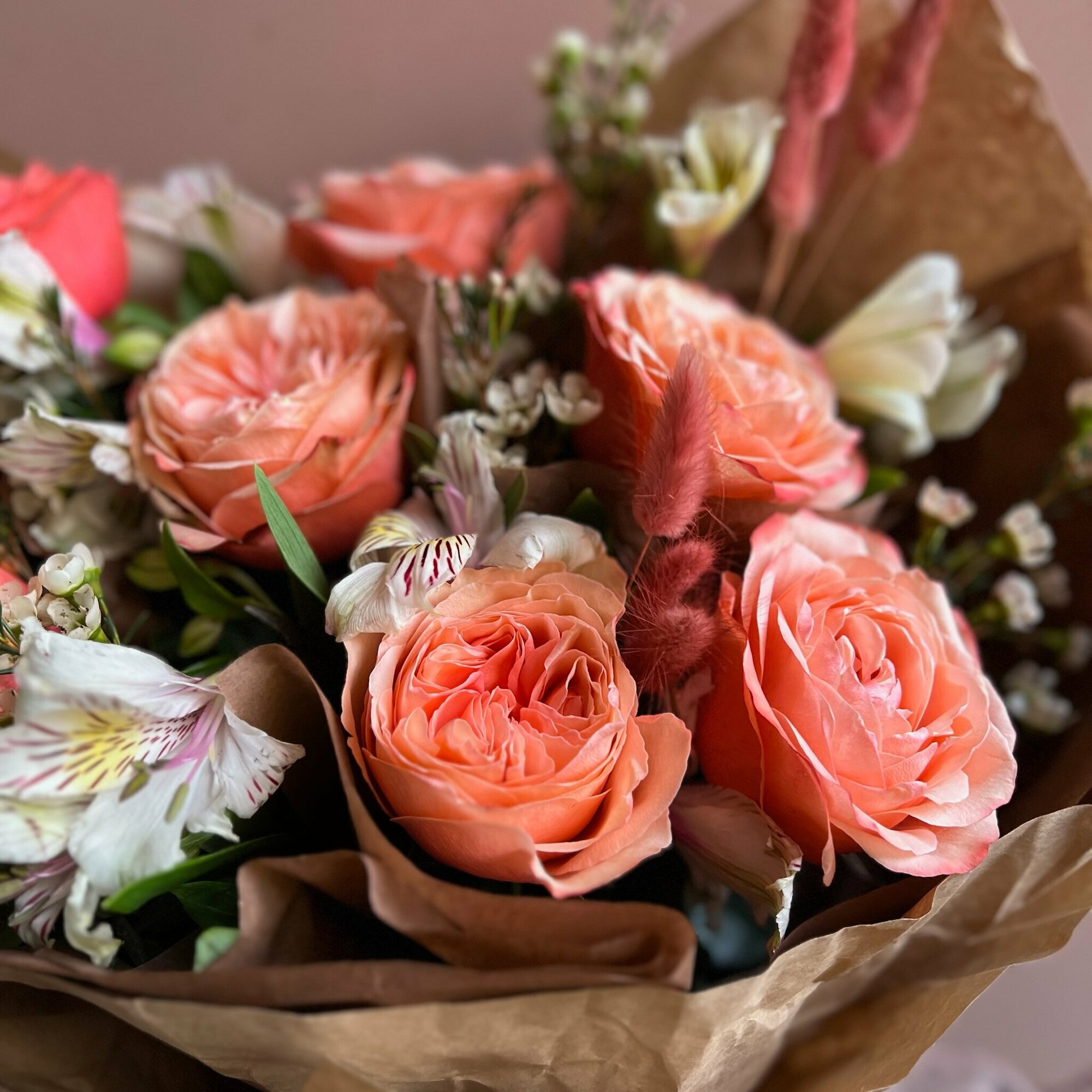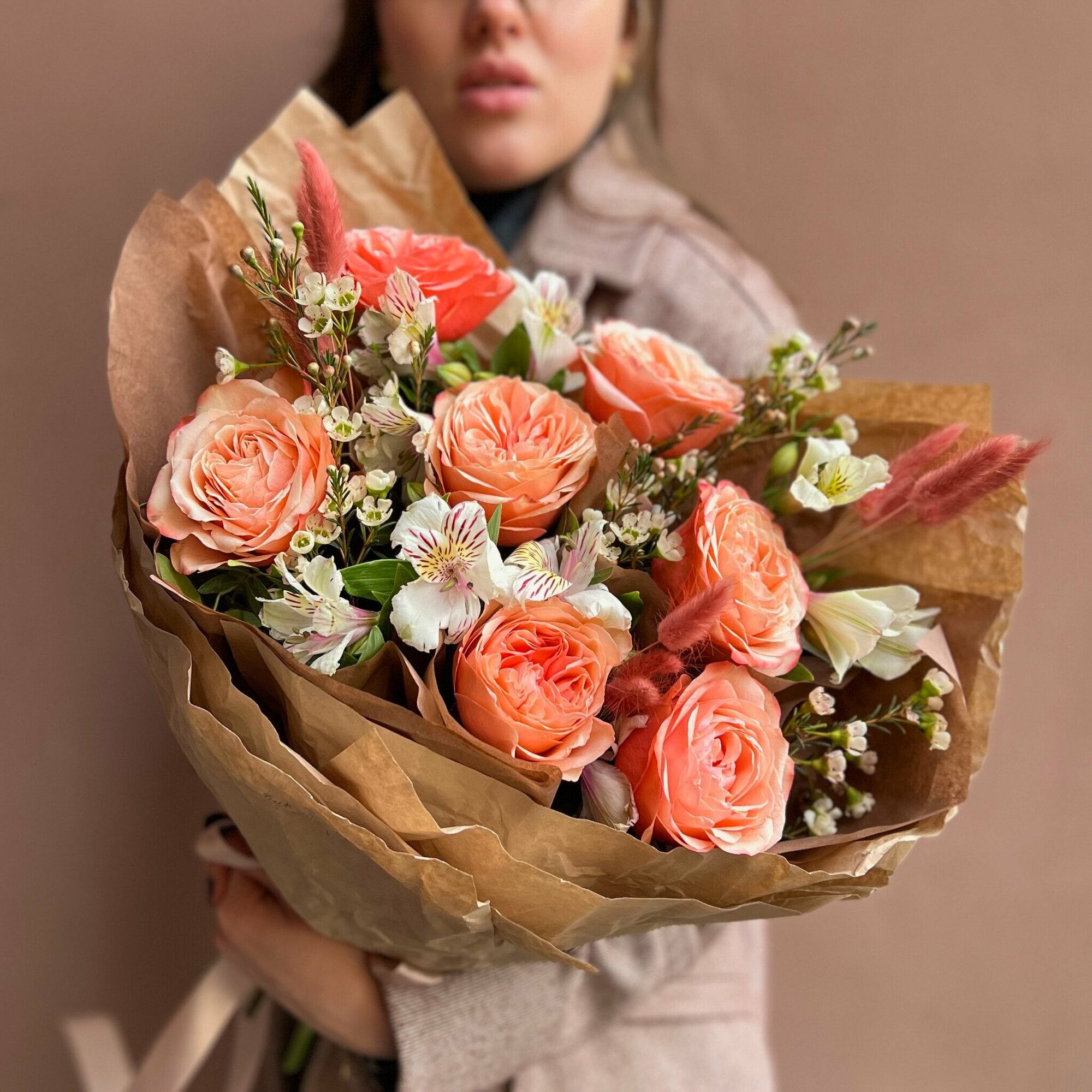 Букет «Александра» – это PETRO, собранное из пионовидных, но одних из самых стойких роз кахала, альстромерий, хамелациума и сухоцветов лагурус.