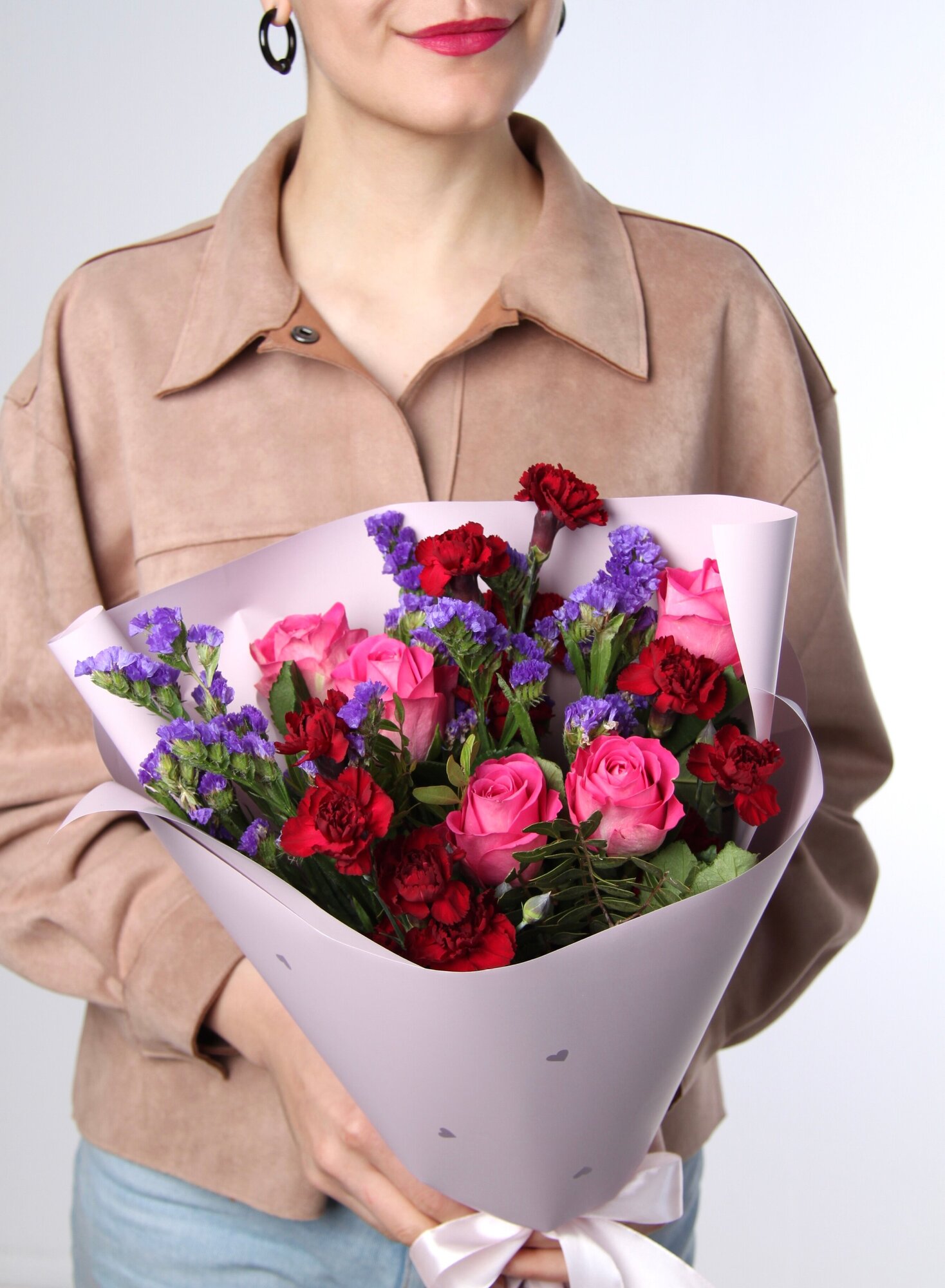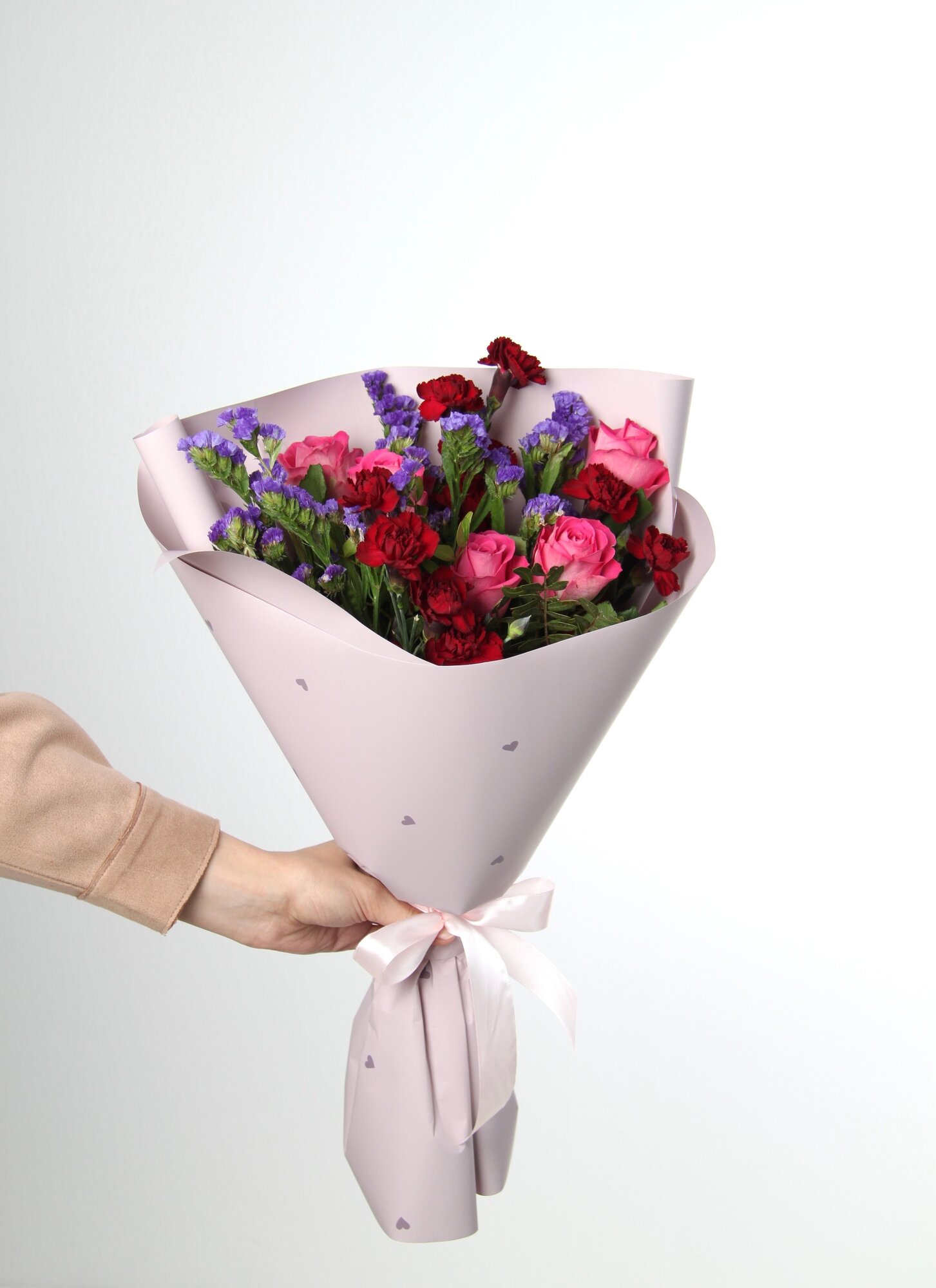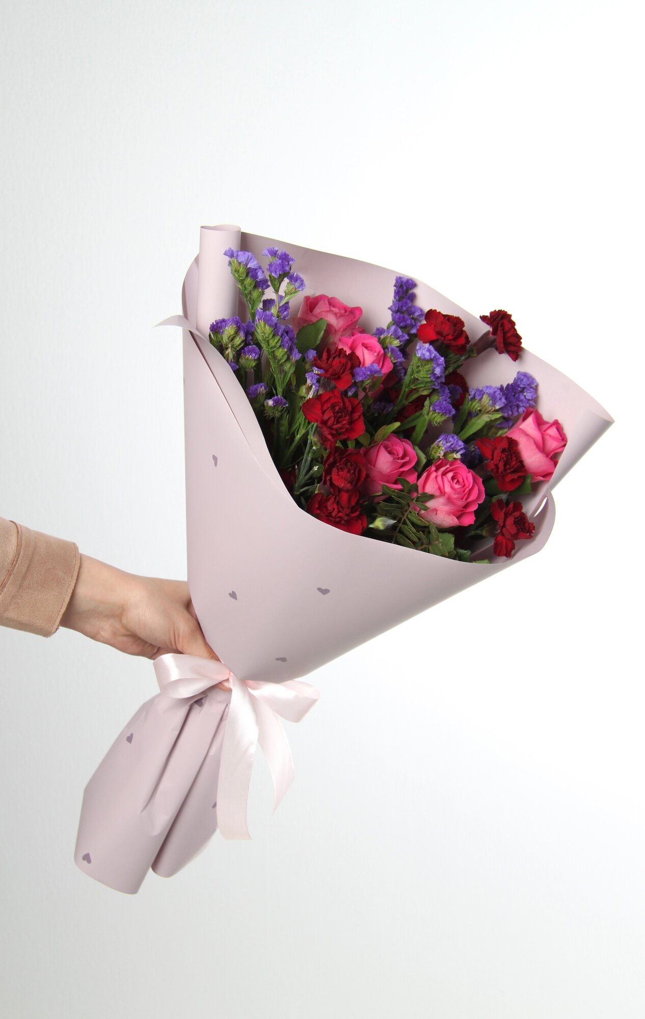 Матовая пленка придает букету элегантный и стильный вид, сохраняя свежесть цветов на долгое время. Высота букета составляет 40 см, что делает его оптимальным размером для большинства интерьеров и мероприятий.