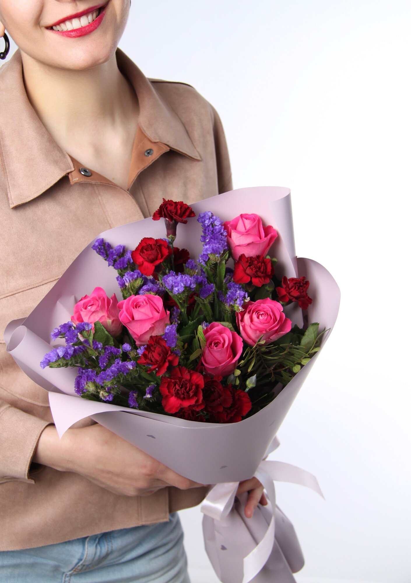 Сборный букет позволяет создать уникальный дизайн, сочетая разные цвета и формы. Зелень фисташки добавляет свежести и контраста, делая букет еще более привлекательным.