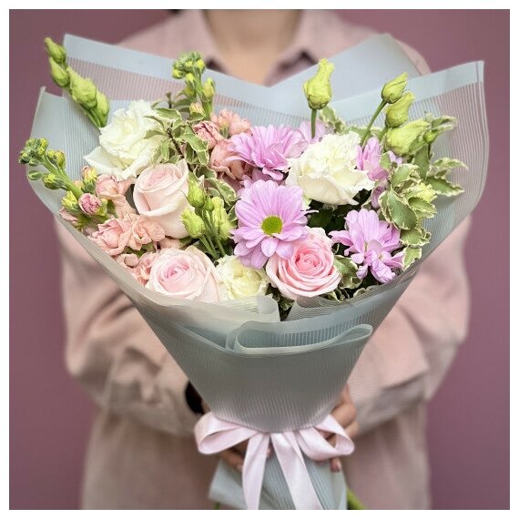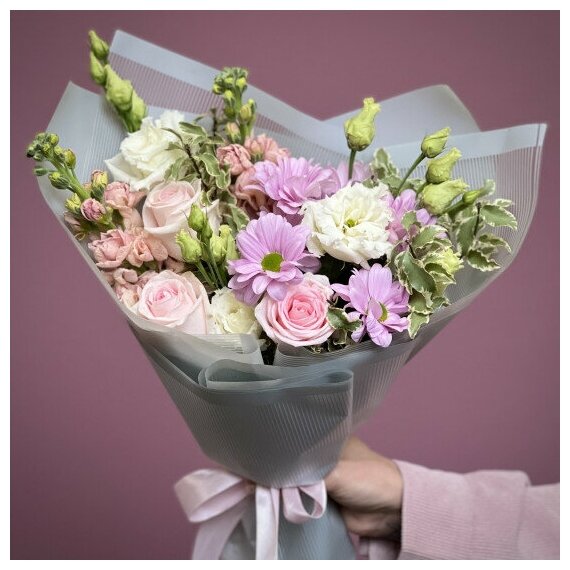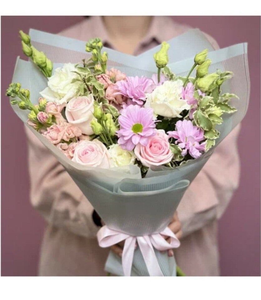 Состав букета: Хризантема кустовая 1 шт Эустома 1 шт Маттиола 2 шт Роза (40 см) 3 шт Питтоспорум Оформление 1 шт
