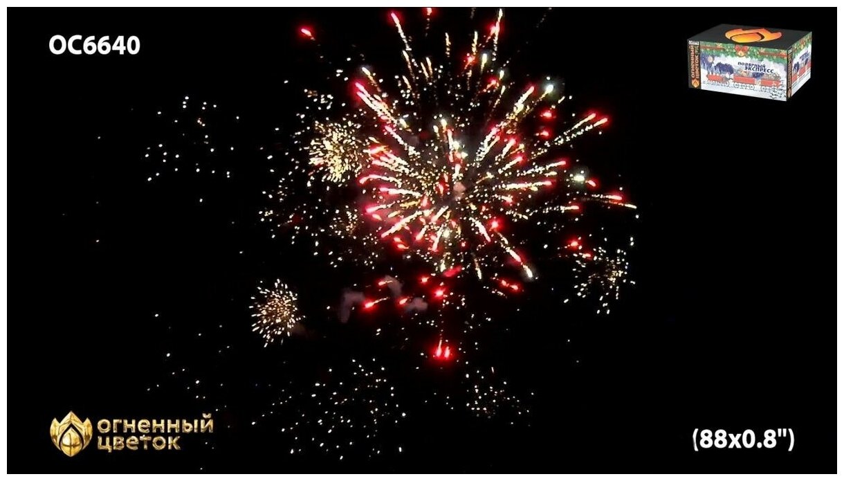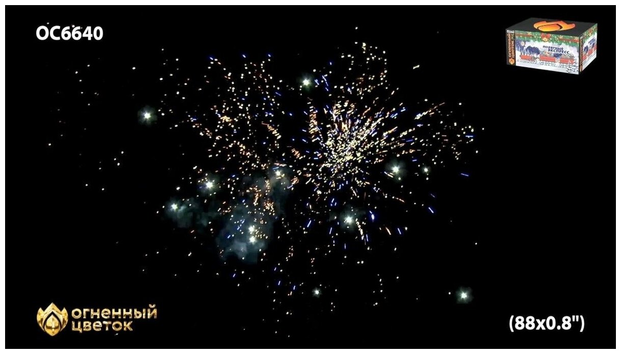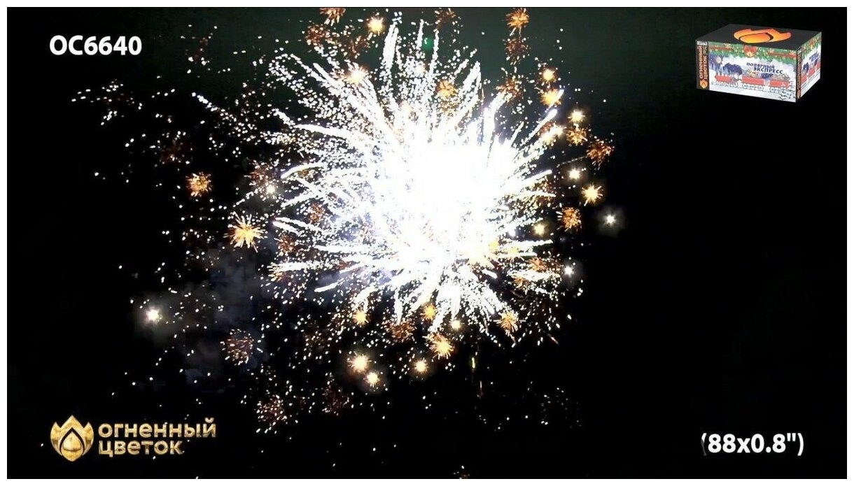 Фейерверк имеет 88 зарядов, что обеспечивает продолжительность работы до 60 секунд. Высота подъема достигает 30 метров, что делает его заметным и впечатляющим.