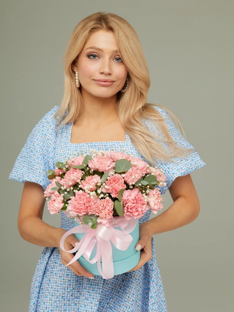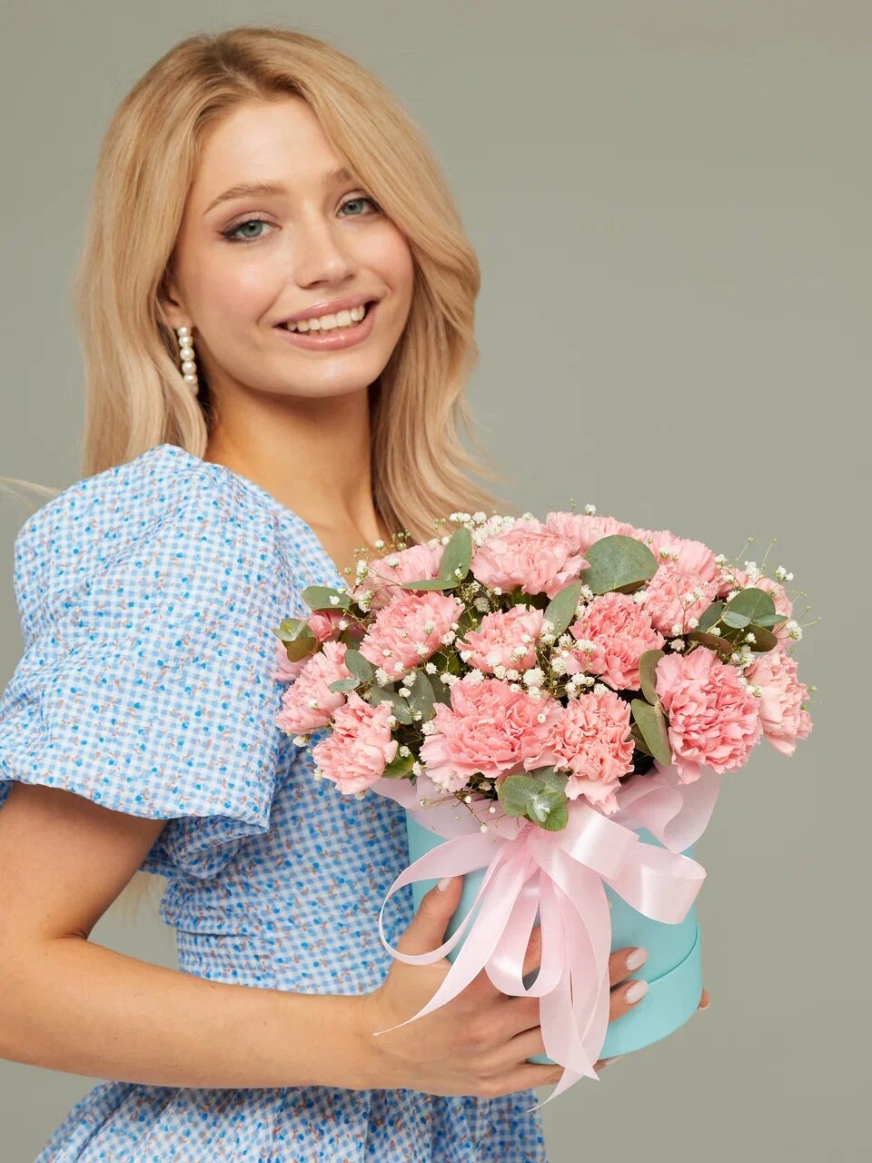 В комплекте с композицией идут атласная лента и шляпная коробка, что позволяет легко и быстро оформить подарок.