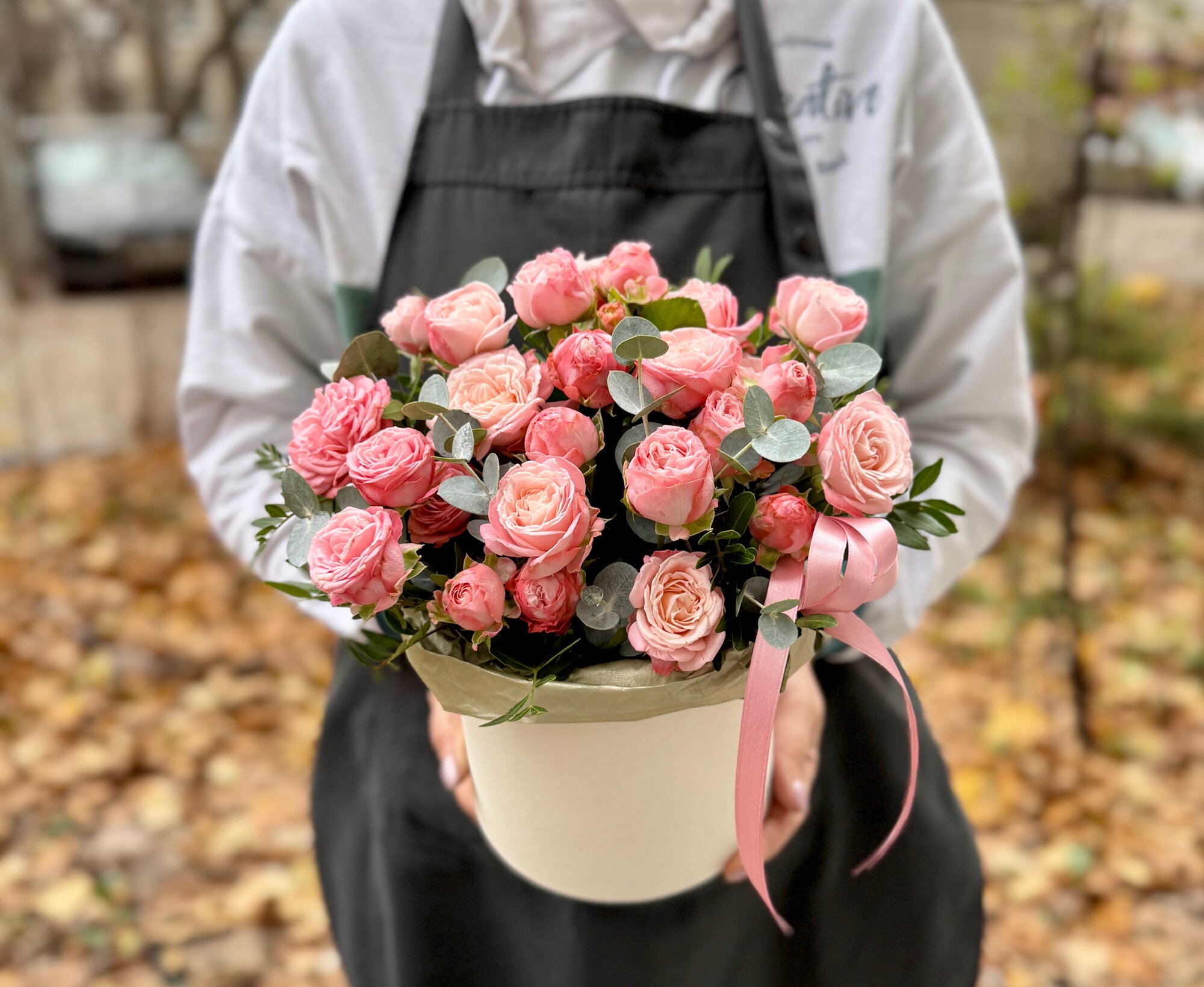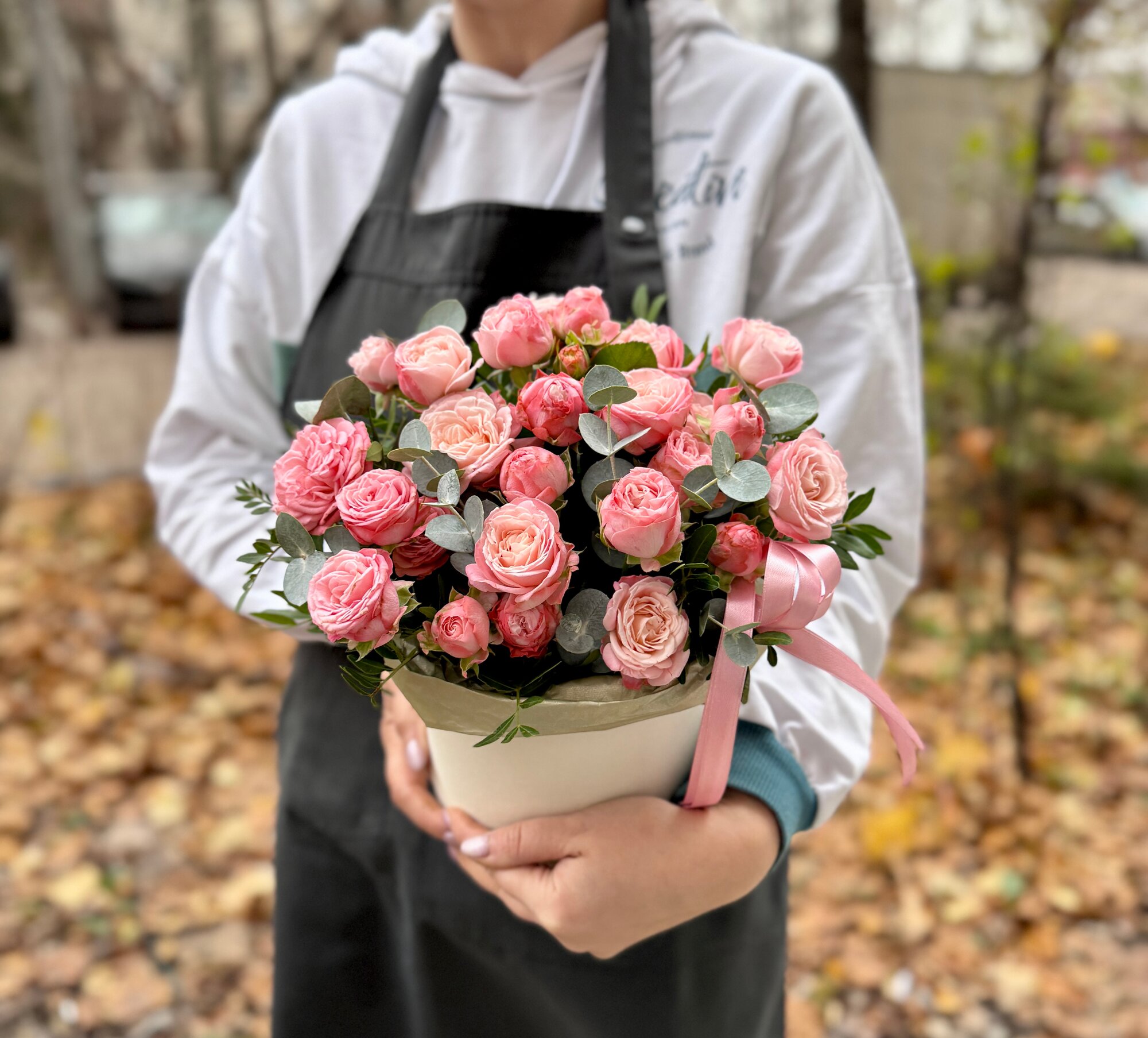 Композиция в коробке - это уникальное сочетание свежих кустовых роз и ароматного эвкалипта.