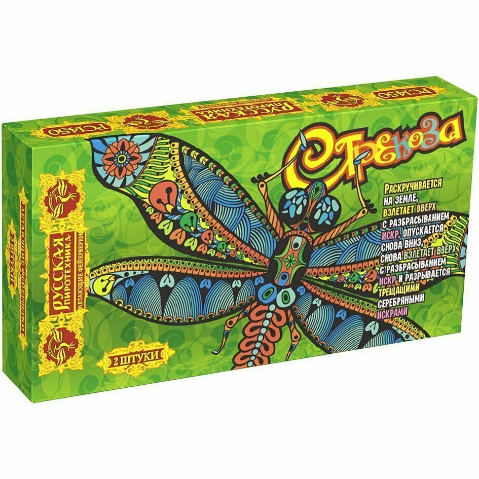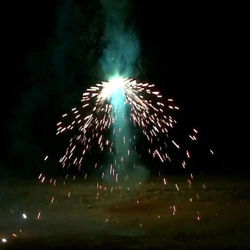 Раскручивается на земле, взлетает вверх с разбрасыванием искр, опускается снова вниз, снова взлетает вверх разбрасывает искры и разрывается трещащими серебряными искрами.