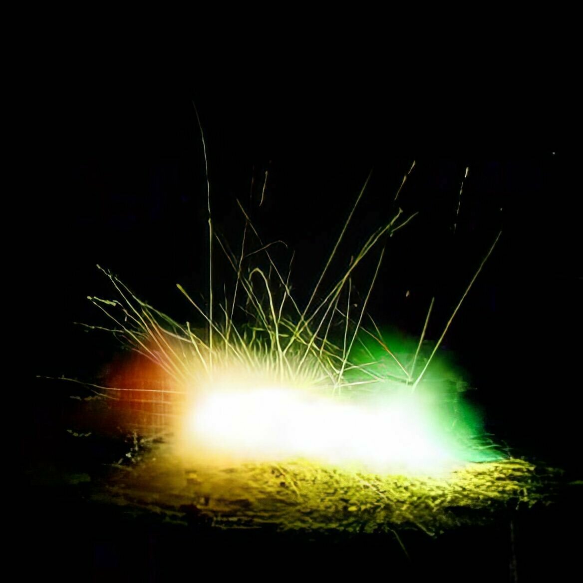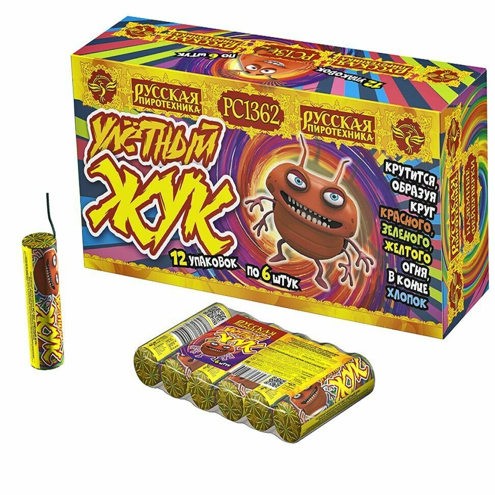 Наземный фейерверк "Улётный жук" создает впечатляющий зрелищный эффект, когда огненные шары вращаются вокруг оси, образуя красивый круг из яркого красного, зеленого и желтого огня.