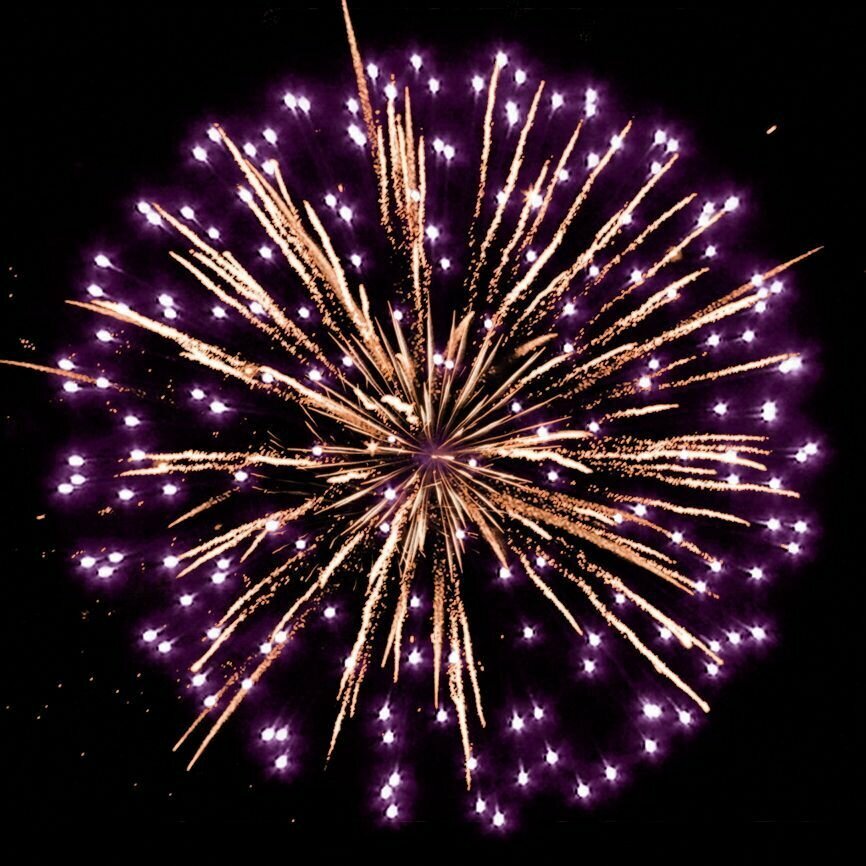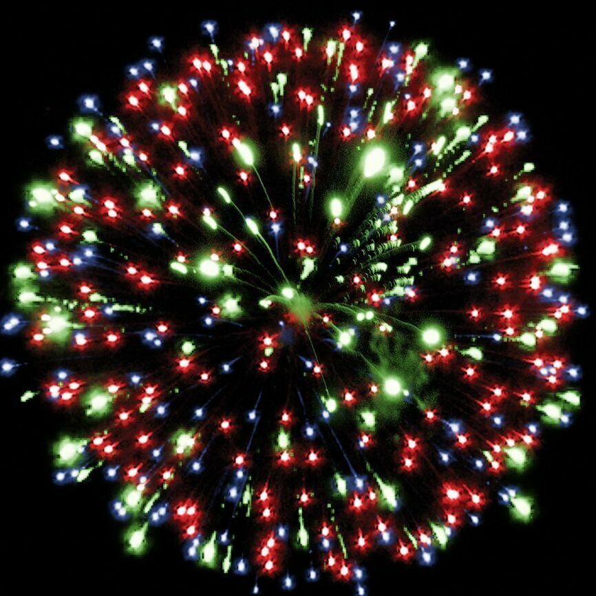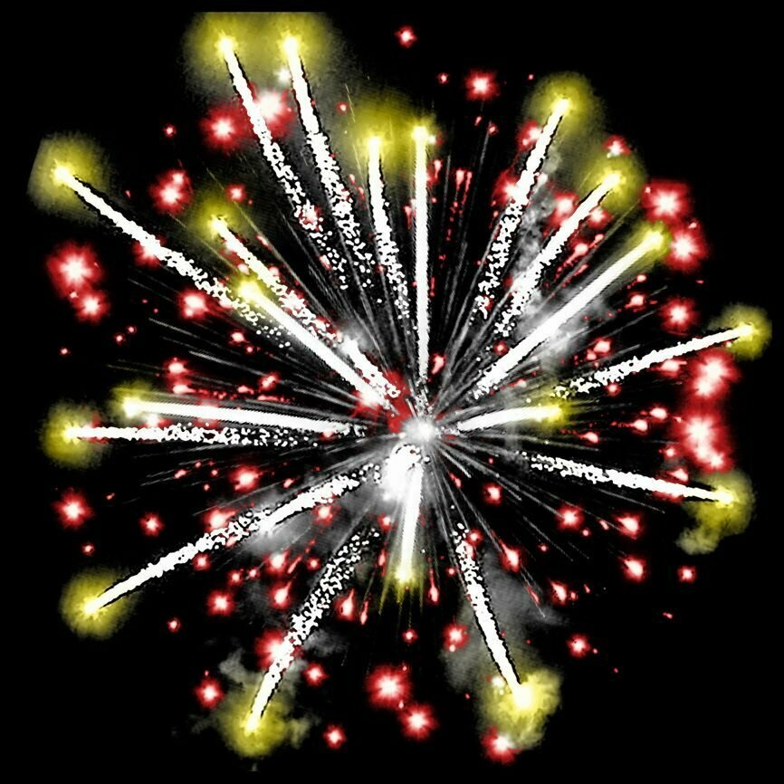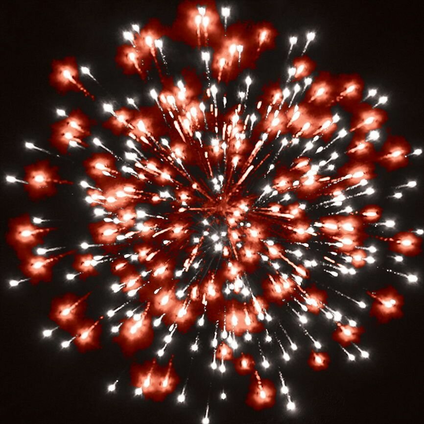 Эффекты: 1. Разноцветные кометы разрываются сферами из красных и белых мерцающих огней. 2. Множество трещащих искр. 3. Серебряные форсы с жёлтыми огнями на концах и красные мерцающие огни. 4. Синие, крупные красные и зелёные огни. 5. Золотые форсы и фиолетовые огни.